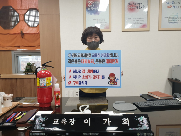 청도교육지원청 이가희 교육장<사진>이 3월 신학기를 맞아 화재로부터 소중한 생명과 재산을 보호하고, 화재감지기와 소화기의 중요성을 알리고자 ‘119 릴레이 챌린지’에 동참했다고 밝혔다.