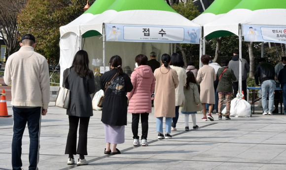↑↑ 대구 지역 코로나19 확진자가 5명으로 집계된 지난 15일 오전 중구 국채보상운동기념공원에 마련된 임시선별검사소에서 시민들이 검사를 받기 위해 줄 서 기다리고 있다. <뉴시스 제공>