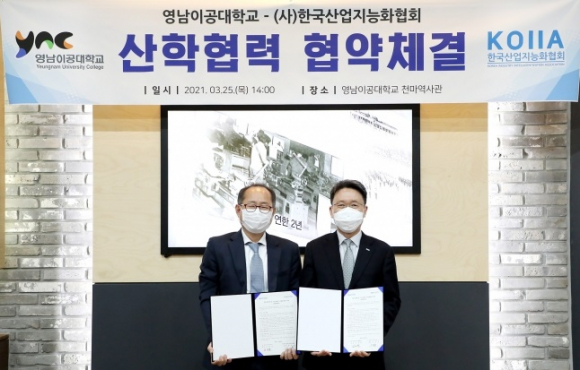 영남이공대와 (사)한국산업지능화협회가 지난 25일 영남이공대 천마스퀘어 2층 천마역사관에서 산업지능화 및 스마트제조 산업발전을 위한 산학협력 협약을 체결했다고 밝혔다.