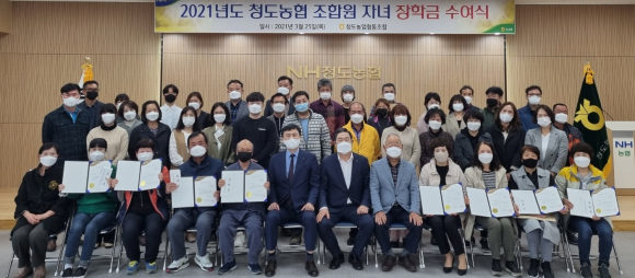| ↑↑ 박영훈 청도농협 조합장이 청도농협 대회의실에서 조합원 자녀 대학생을 선정, 총 5천만원의 장학금을 전달한 후 관계자와 단체 사진촬영을 하고 있다.<청도농협 제공> |