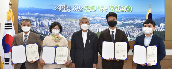 | ↑↑ 이기동 경산시의회 의장(가운데)이 시의회 의장실에서 결산검사 위원들에게 위촉장을 수여한 후 기념촬영을 하고 있다. |
