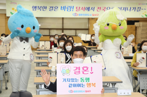 | ↑↑ 이태훈 대구 달서구청장(맨앞)이 제3기 결혼친화 서포터즈단과 결혼표어 공모 최우수작인 '결혼! 가치있는 동행, 같이여는 행복' 슬로건을 들고 적극적인 활동을 다짐하고 있다.<달서구 제공> |