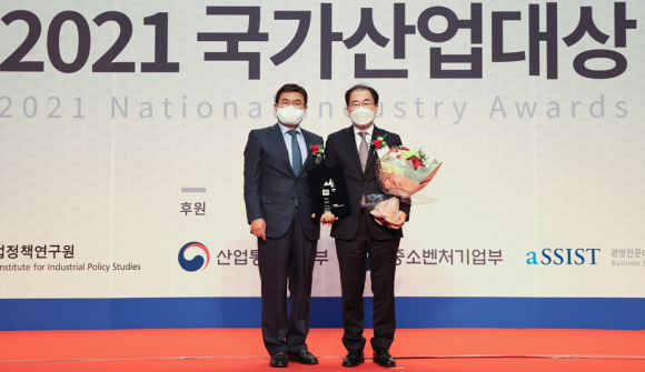 | ↑↑ 이승 경영관리부사장(오른쪽)이 서울 스위스그랜드호텔에서 열린 '2021 국가산업대상' 시상식에서 한국가스공사가 '동반성장 대상'을 수상한 후 기념촬영을 하고 있다. 가스공사 제공 |