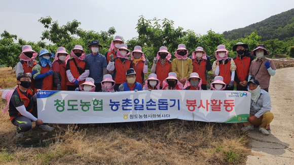 | 청도농협 사랑봉사단이 지난 달 25일 영농철을 맞아 일손부족으로 어려움을 겪고 있는 농가를 방문해 농촌일손돕기 봉사활동을 펼쳤다. 이날 봉사활동에는 청도농협(조합장 박영훈)임직원 및 청도농협여성대학(회장 홍혜순) 회원 등 30여명이 함께 했다. 이날 참가자들은 청도읍 안인리의 복숭아 및 대추농장을 방문하여 적과 및 순치기 작업 일손돕기를 실시했다. 청도농협 박영훈 조합장은 “코로나19로 인한 외국인 근로자 부족 및 사회적거리두기로 인한 봉사활동 기피등으로 농촌 일손부족이 심각하다며 농촌일손돕기가 일회성으로 그치지 않고 지속적으로 추진해 청도농협이 농가에 힘이 될 수 있도록 하겠다”고 말했다.
