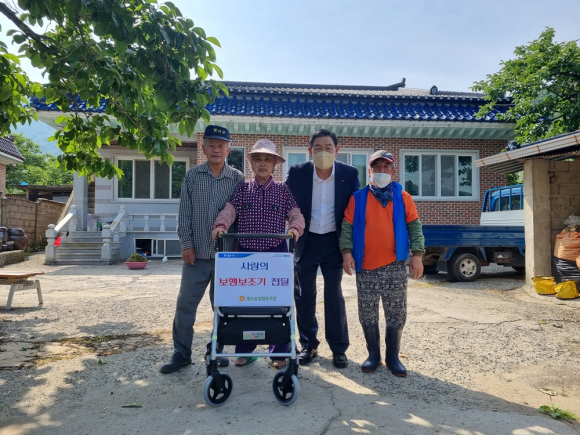 | ↑↑ 청도농협이 지난 1일 거동이 불편한 고령조합원을 위해 보행보조기를 전달하고 있다. 청도농협 제공 |