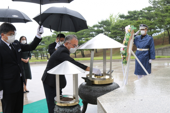 | ↑↑ 신봉재 대구조달청장은 3일 ‘호국보훈의 달’ 6월을 맞아 직원들과 국립영천호국원을 방문해 현충탑을 참배했다.<디구조달 제공> |