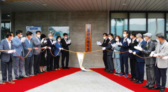 | ↑↑ 최영조 시장과 이기동 시의장, 시의원 등 시 체육회 법인설립 출범식을 열고 각계 인사들이 경산시민운동장에서 현판식이 열리고 있다.<경산시 제공> |