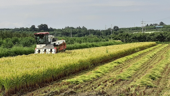 | ↑↑ 경산시 자인면 울옥리 신호철 농가 원당들에서 콤바인으로 추석 햅쌀용으로 재배된 조생종 품종인 해담벼를 올해 첫 수확을 하고 있다. 경산시 제공 |