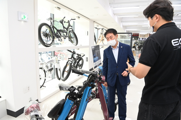 | ↑↑ 배기철 동구청장(왼쪽)이 지역 기업을 방문해 회사 직원으로부터 현장의 애로사항과, 전동킥보드 등 퍼스널모빌리티 제품설명을 듣고 있다. 동구청 제공 |