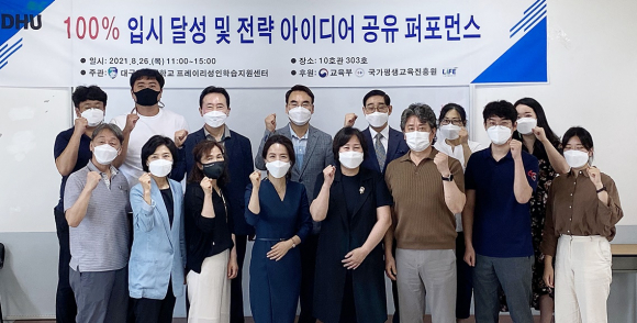 ↑↑ 대구한의대학교 미래라이프융합대학 교직원들이 '100% 입시 달성 및 전략 아이디어 공유 퍼포먼스' 참석자들과 단체 사진촬영을 하고 있다. 대구한의대 제공