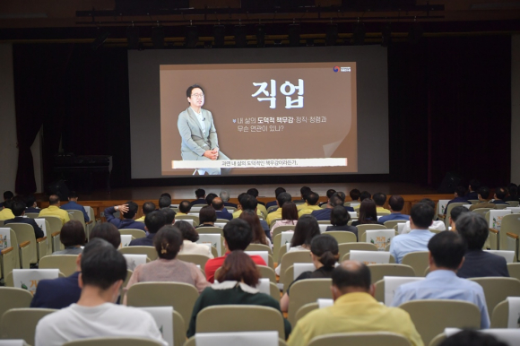 | ↑↑ 청도군이 군민회관에서 군의회 의원, 공직자 등이 ‘공무원의 청렴 및 이해충돌방지법 동영상 교육’이 열리고 있다. 청도군 제공 |