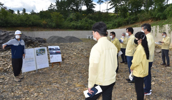 | ↑↑ 남광락 행정사회위원장과 행정사회위원회 의원들이 경산인공암벽장 조성 사업장을 방문해 추진상황을 점검하고 있다. 경산시의회 제공 |