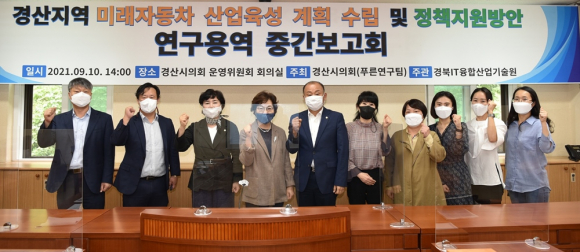 경산시의회(의장 이기동) 의원연구단체 '푸른연구팀'이 지난 10일 의회 운영회의실에서 '경산지역 미래자동차 산업육성 계획수립과 정책지원 방안 연구용역'의 중간보고회를 개최했다고 밝혔다.
