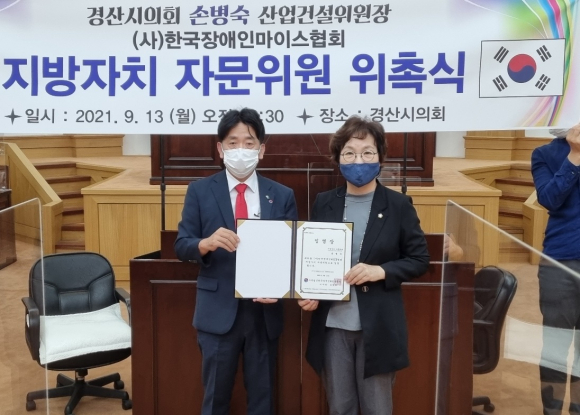 ↑↑ 손병숙 경산시의원(오른쪽)이 ㈔한국장애인마이스협회로부터 지방자치 자문위원으로 위촉하고 사진촬영을 하고 있다. 경산시의회 제공