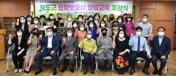 | 이승율 청도군수가 지난 24일 여성회관 3층 교육장에서 김수태 군의장을 비롯해 송근진 군 건강가정·다문화가족지원센터장 등이 참석한 가운데 최종 선발된 교육생 25명이 '따뜻한 돌봄, 청도군 맞춤형 노인케어사업' 요양보호사 1급 양성 교육과정 개강식을 가졌다고 밝혔다.