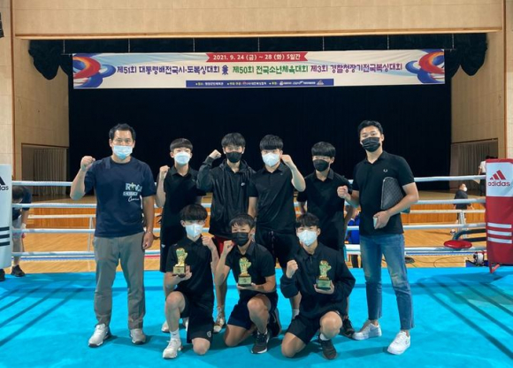 | ↑↑ 경북체육중 김상현 복싱부 감독과 김성환 전임지도자는 우수지도자로 선정, 김량우(3학년) 선수와 송세영(2학년) 선수가 1위, 황희준(2학년) 선수는 3위를 각각 차지했다.<경북체육중 제공> |