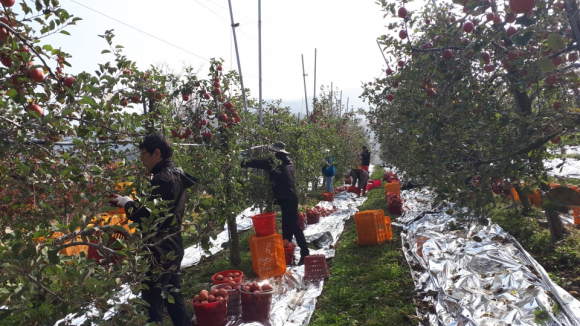 군위군 소보면 행정복지센터 직원 15여 명은 지난 5일 사과재배농가를 방문, 사과수확 농촌일손돕기를 실시했다.