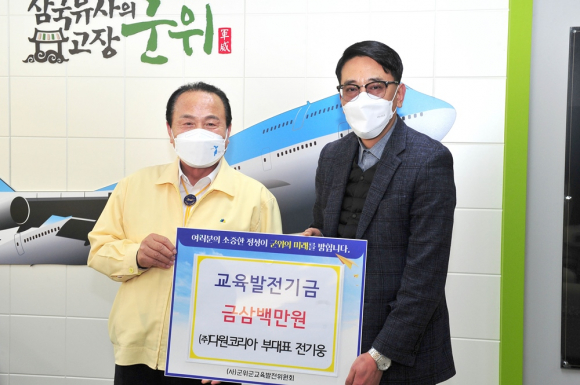 | ㈜다원코리아 전기웅 부대표는 지난 3일 군청을 방문하여 지역의 교육발전과 인재양성을 위한 교육발전기금 300만 원을 기탁했다.