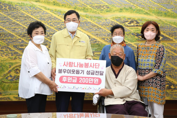 | 경주 사랑나눔봉사단이 교통장애인 처우개선을 위해 한국교통장애인협회 경주시지회로 200만원 후원금을 지난달 29일 전달했다.