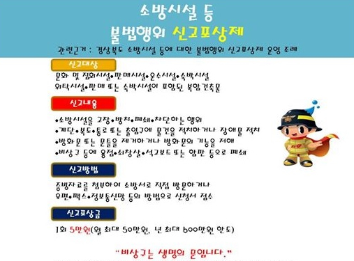 신고 포상 대상은 위락시설, 판매시설, 복합건축물, 운수시설, 숙박시설, 문화 및 집회 시설, 의료시설, 노유자 시설 등으로, 비상구 폐쇄 및 복도·계단 출입구 폐쇄·피난통로에 물건을 적치하는 등 피난에 지장을 주는 행위 등의 위반 행위를 신고하면 된다.