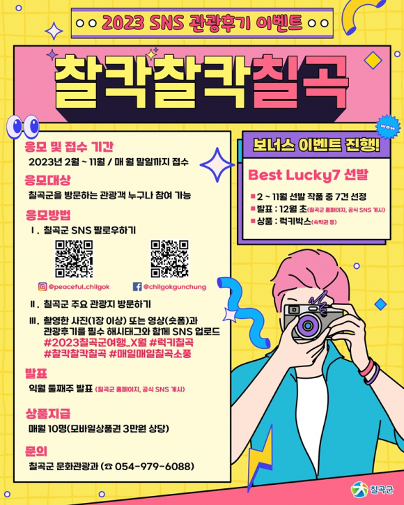 | 칠곡군은 ‘매일매일 칠곡소풍’ 관광 브랜드를 홍보하고 오감만족 문화관광도시로 새롭게 도약하기 위해 ‘찰칵찰칵 칠곡’ SNS 관광후기 이벤트를 2월부터 11월까지 진행한다.