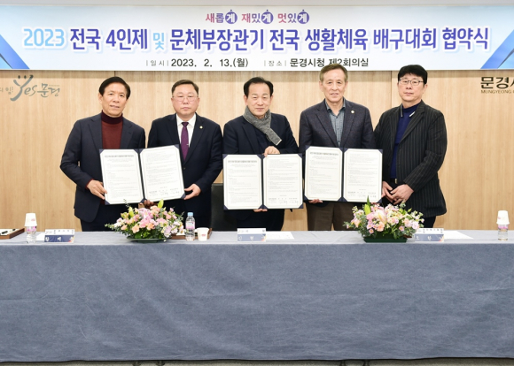 | 2023 전국 4인제 배구대회 및 문체부장관기 전국 생활체육 배구대회 업무협약을 체결했다(문경시제공) | 문경시는 지난 13일 「2023 전국 4인제 배구대회」 및 「문체부장관기 전국 생활체육 배구대회」의 성공적인 개최를 위하여 대한배구협회·한국9인제배구연맹과 업무협약을 체결했다.