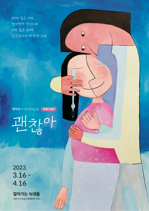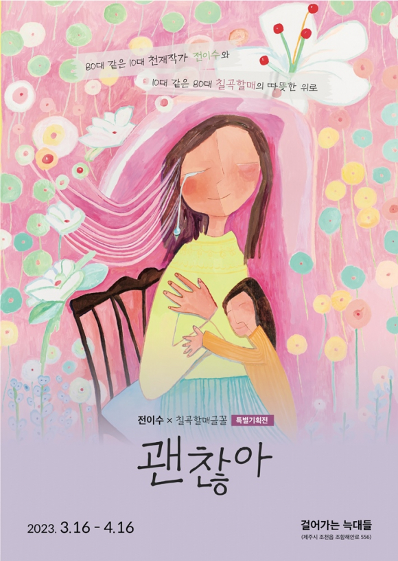 꾹꾹 눌러쓴 손글씨를 디지털 글씨체로 만든 칠곡할매글꼴로 인기를 얻고 있는 할머니들과 천재 작가 전이수는 내달 16일부터 제주시에 위치한 미술관‘걸어가는 늑대들’에서‘괜찮아’라는 주제로 특별 기획전을 연다. 이번 기획전은‘10대 같은 80대 경북 칠곡군 할머니’와‘80대 같은 10대 제주 소년’이 코로나와 고물가로 힘들어하는 대한민국 국민에게 따뜻한 위로와 사랑의 메시지를 전하기 위해 마련됐다. 여덟 살 때 책을 출간한 열다섯 동화작가 전이수는 독특한 감성과 터치로 일상의 삶에서 위로를 전하는 따뜻한 글과 그림으로 13권의 책을 펴내며 연달아‘베스트셀러’에 올랐다. 기획전은 걸어가는 늑대들에 전시된 전 작가의 작품 40여 점에 담겨있는 의미를 칠곡할매글꼴로 설명하고 칠곡 할머니의 인생과 삶이 녹아있는 시집과 시화를 선보인다. 칠곡할매글꼴 할머니들은 전 작가의 그림을 감상하고“시험 못 봐도 괜찮아, 손자는 잘만 살더라”처럼“00해도 괜찮아 000 하더라”라는 형식의 대국민 응원 문구를 캔버스에 담아 전시한다. 이와 함께 전 작가 그림과 칠곡할매글꼴로 제작한 그림엽서에 자신을 응원하는 메시지를 남기면 일 년 후에 도착하는‘느린 시간도 괜찮아’도 마련된다.