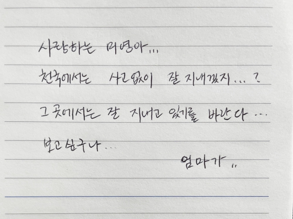 | ↑↑ 박 의원은 입원으로 대구지하철참사 추모식에 참석하지 못하자 수첩에“미영아! 천국에선 사고 없이 잘 지내겠지 그곳에서는 잘 지내고 있기를 바란다. 보고 싶구나”라는 메모를 남기며 딸의 넋을 기렸다. <칠곡군 제공> |