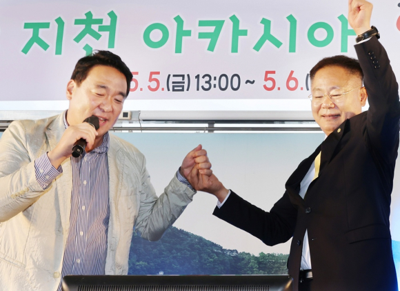 정희용 국회의원은 지난 5일‘지천 아카시아 한마당 축제’개막식에서 김재욱 칠곡군수의 손을 잡고 가요‘파트너’를 부르며 끈끈한‘브로맨스’를 선보였다.