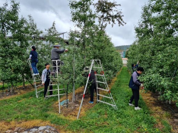영양군 입암면사무소는 본격적인 영농철을 맞아 갑작스런 사고로 농사에 어려움을 겪고 있는 관내 농가를 대상으로 지난 19일 농촌일손돕기에 나섰다. 이날 일손돕기는 입암면사무소, 유통지원과, 환경보전과, 문화시설사업소 직원 20여명과 함께 입암면 신구리에 위치한 과수원에서 사과 적과작업을 지원했다.