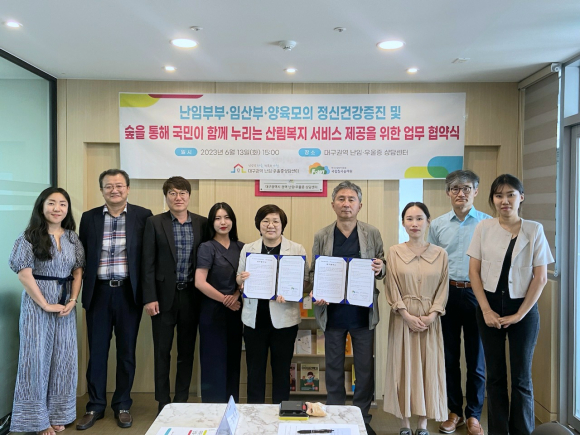 양 기관은 이번 협약으로 숲태교 등 생애주기별 산림복지서비스를 통한 출산장려, 임산부의 정신건강 증진사업을 위한 협업 기반을 마련하였으며, 이날 협약식은 대구광역시 중구에 위치한 난임‧우울증상담센터에서 조영순 숲체원장과 이택후 센터장 등 주요 관계자들이 참석한 가운데 진행되었다.
