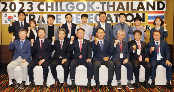 | ↑↑ 태국 방콕에 마련된 칠곡군 상담회장에서 성공적인 일정을 마무리하고 기념 촬영을 하고 있다.<칠곡군 제공> |