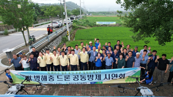 | 칠곡군농업기술센터는 지난 8일 북삼읍 숭오리 일원에서 김재욱 군수를 비롯해 도의원, 군의원, 농협관계자, 쌀전업농 등 100여명이 참석한 가운데 벼 병해충 드론 공동방제 시연회를 개최했다.