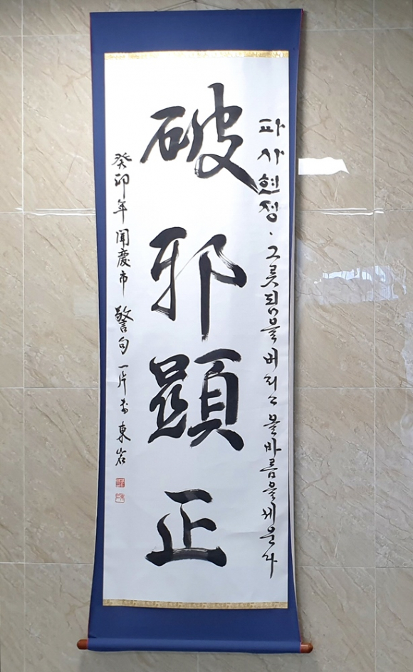파사현정(破邪顯正), 참 엄숙하고 무서운 말이다. ‘사악(邪惡)하고 그릇된 생각을 깨뜨리고 올바른 도리(道理)를 드러낸다(顯正). 행(行)한다’는 이 말을 올해의 경구로 삼은 것은 처신을 바르게 하고 진실하게 살아야 한다는 것을 강조함이며, 특히 지도자급 위치에 있는 사람은 더욱 가슴에 새겨야 한다는 것인데, 아무리 좋은 글귀도 눈앞 비루빡에 붙여 놓고 매일 본다 한들 어리석고 못난 사람에게는 소귀에 경 읽기일 뿐이다.
