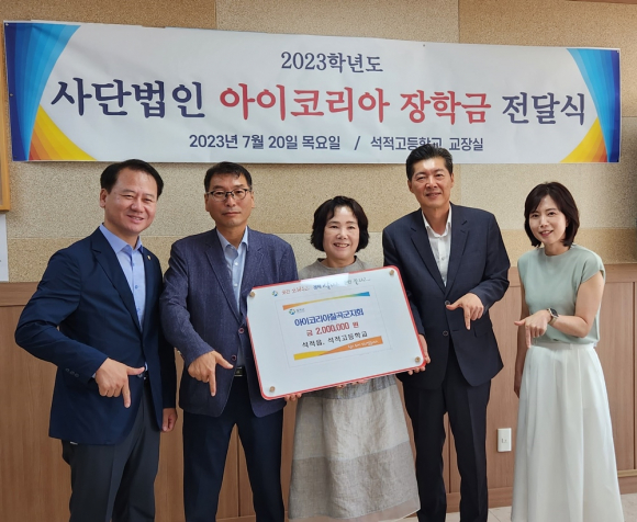 | 아이코리아 칠곡군지회는 지난 20일 석적고등학교 교장실에서 ‘아이코리아 장학 증서 수여식’을 가졌다.