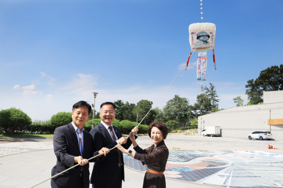 | ↑↑ 김재욱 칠곡군수(가운데), 백남희 여사, 마산서부지역전투 기념사업회 김경환 대표가 워커 장군 대형 방패 연을 날리고 있다.<칠곡군 제공> |