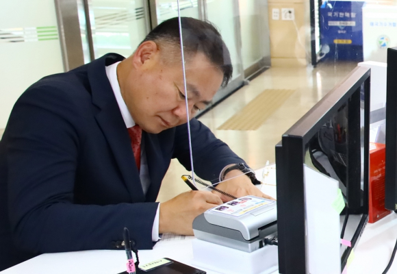 | ↑↑ 김재욱 칠곡군수가 최근 석적읍사무소에서 전입 신고를 하고 있다. <칠곡군 제공> |