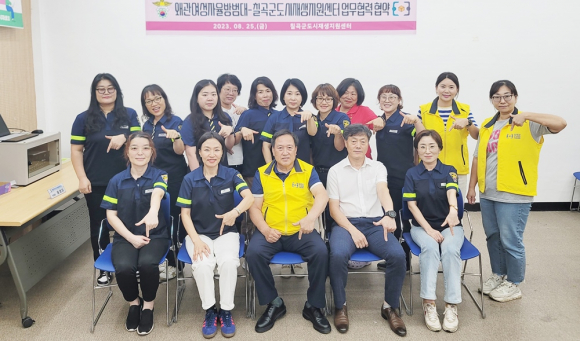 | ↑↑ 칠곡군도시재생지원센터와 왜관여성자율방범대와 지난 25일 도시재생뉴딜사업지구 범죄 예방과 취약 계층 안전을 위한 업무협약을 체결하고 두 손을 맞잡았다.<칠곡군 제공> |