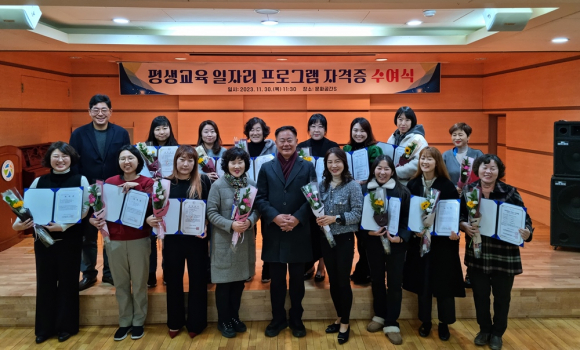 이번 과정은 미술심리치료사, 하브루타 지도자, 전래놀이 지도사, 보드게임 및 창의수학 지도사 전문자격증 과정으로 수료생들의 95%이상이 자격증 취득에 합격해 11월 30일 교육문화회관에서 자격증 수여식을 했다.