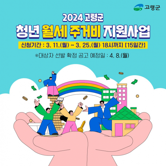고령군이 월세를 지원해 청년층의 주거비 부담을 완화하고 안정적 정주 여건을 조성하기 위해 오는 11일~25일까지 2024년 고령군 청년 월세 주거비 지원사업 대상자를 모집한다.