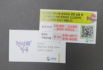 명함에는 청렴문구와 칠곡 공직자 비리신고센터로 자동 연결되는 QR코드를 삽입해 부패행위 신고에 편의를 더 했다.