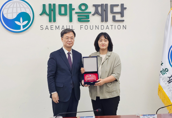| ↑↑ 김명신(오른쪽) 칠곡군 아이누리장난감도서관장이 지난달 25일 회원들의 기부를 받아 라오스 농사이 마을에 장난감을 보낸 공로를 인정받아 이승종 새마을재단 대표이사로부터 감사패를 받고 있다. <칠곡군 제공> |