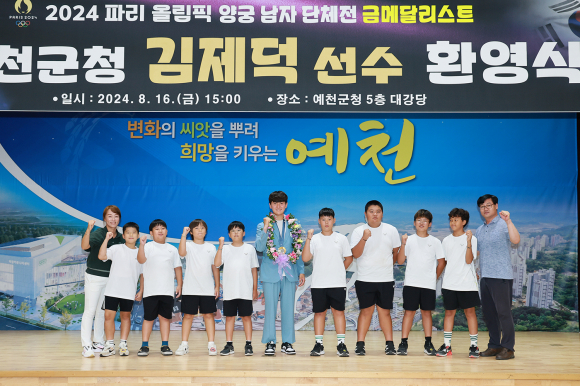 | 예천군이 지난 16일 청내 대강당에서 2024 파리올림픽 양궁 남자단체전 금메달을 획득한 예천군청 소속 김제덕 선수 환영식을 개최했다.