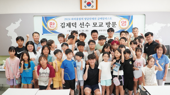 | 예천초등학교가 지난 20일 교내 연수실에서 2024 파리올림픽 양궁단체전 금메달리스트 김제덕 선수의 깜짝 방문 행사를 실시 했다.