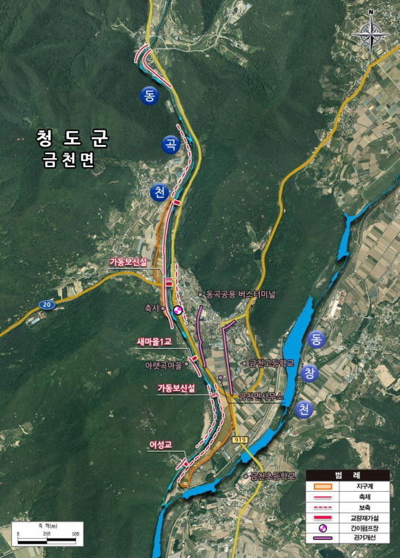 소진지구 풍수해생활권 종합정비사업 총사업비는 320억(국비 160억 도비 48억 군비 112억)으로 하천제방 정비 2.1km, 교량 재설치 7개 소, 급경사지 정비 2개 소 등을 주요 계획으로 포함하고 있으며, 동곡 자연재해위험개선지구 정비사업은 총사업비 372억(국비 186억, 도비 56억, 군비 130억)이며, 하천정비 L=4.71㎞, 교량 4개소, 우수관거 개선 등을 시행 할 예정이다.