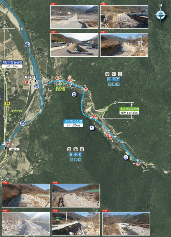소진지구 풍수해생활권 종합정비사업은 운문천과 소진천 시설노후, 규격미달 제방시설로 집중호우 및 태풍 내습 시 월류로 인한 침수피해가 지속적으로 발생하는 지역이다.