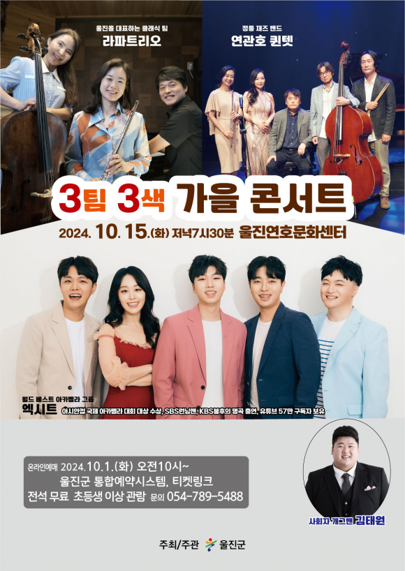 또한 연호문화센터에서는 기획공연‘3팀3색 가을콘서트’가 15일 저녁 7시 30분에 개최되며, 울진의 대표 클래식 팀 ‘라파트리오’, 혼성 5인조 아카펠라 그룹 ‘엑시트’, 정통 재즈밴드‘연관호 퀸텟’3팀의 공연을 한 자리에서 감상할 수 있다.