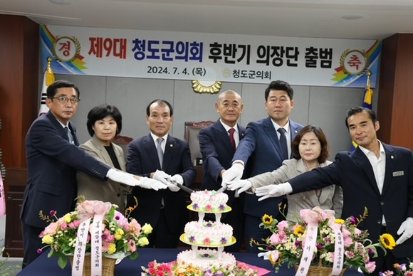| ↑↑ 전종율 청도군의회 의장과 김효대·박성곤·김태이·이수연·김규봉·이승민 의원 등이 지난 7월4일 제9대 청도군의회 후반기 의정활동의 시작을 알리는 출범 기념행사가 열리고 있다. 청도군의회 제공 |
