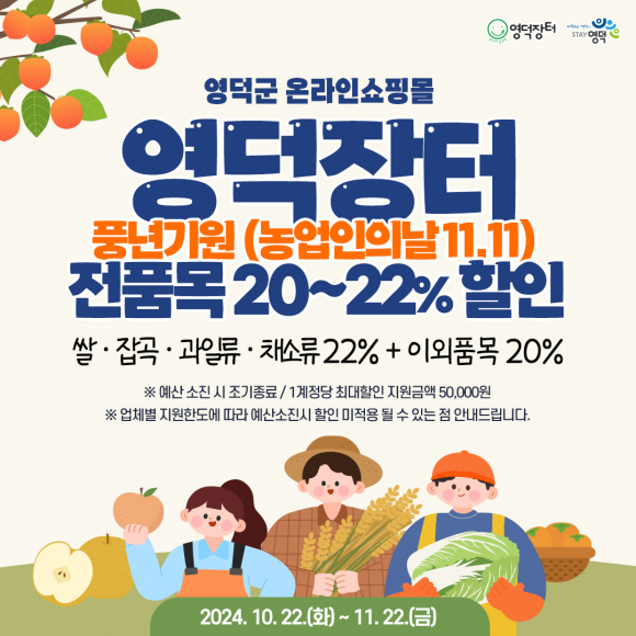 영덕 농·수 특산물 온라인 쇼핑몰인 영덕장터(ydmall.cyso.co.kr)가 오는 11월 11일인 농업인의 날을 기념하고 풍년을 기원하는 의미로 이달 22일부터 한 달 동안 할인 이벤트를 진행한다.
