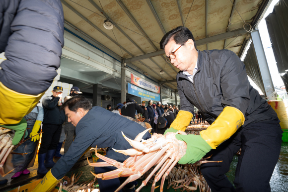 경매 현장을 찾은 김광열 군수는 김성식 강구수협장 등과 함께 어업인, 강구대게거리 상인, 중매인들을 격려하고 영덕대게를 포함한 수산업 발전에 여러 의견을 나눴다.